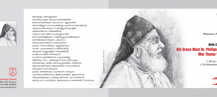 The Birth Centenary Celebrations of the Valiya Thirumeni is scheduled to be conducted on Thursday, the 27th April 2017 at Sabha Head Quarters at Thiruvalla. This Birthday Celebration is also the culmination of all the Birth Centenary Celebrations conducted by the different Dioceses of the Mar Thoma Church.